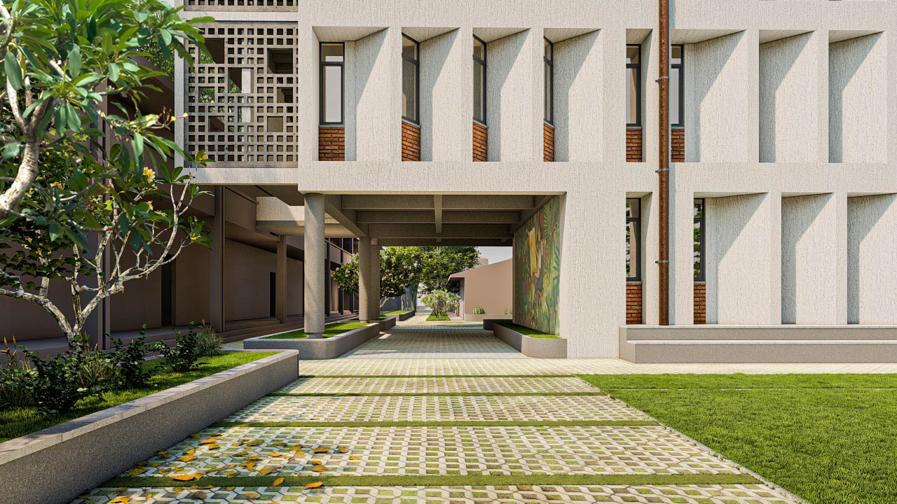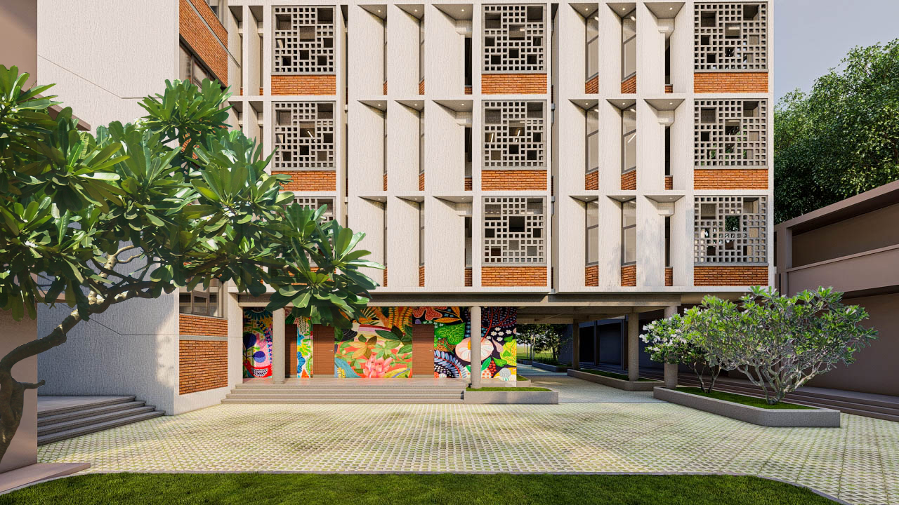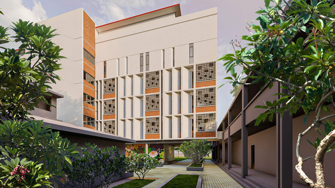 A Green retrofit act as the main link, connecting surrounding blocks, at different levels, encouraging connectivity among the users. More practical, student centric, climatic responsive building is with more generous spaces, improved by strategic use of openings and façades, dramatically reducing the building ‘s peak heat gain to enhance the natural lighting quality of the interiors.